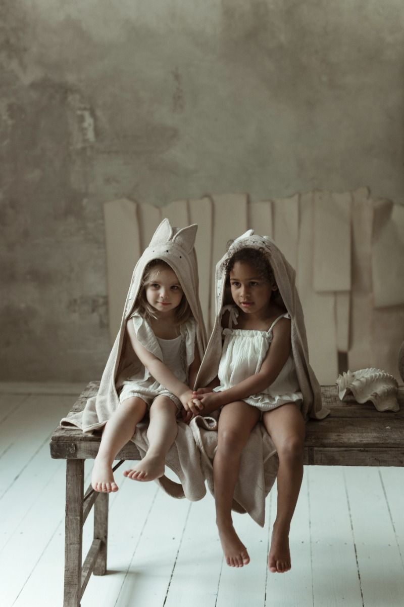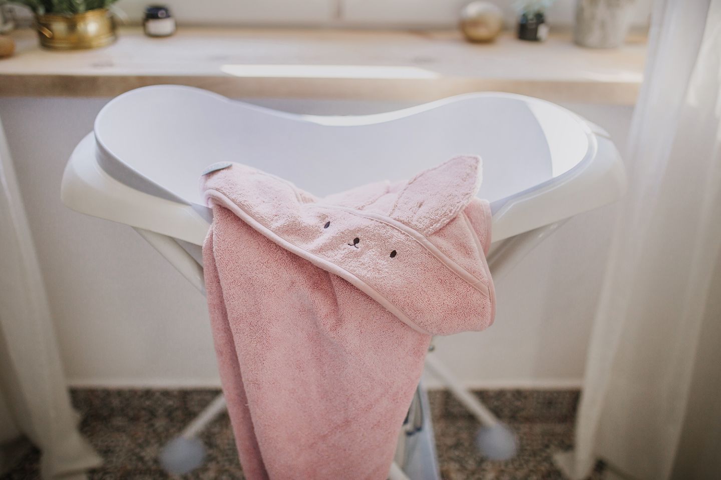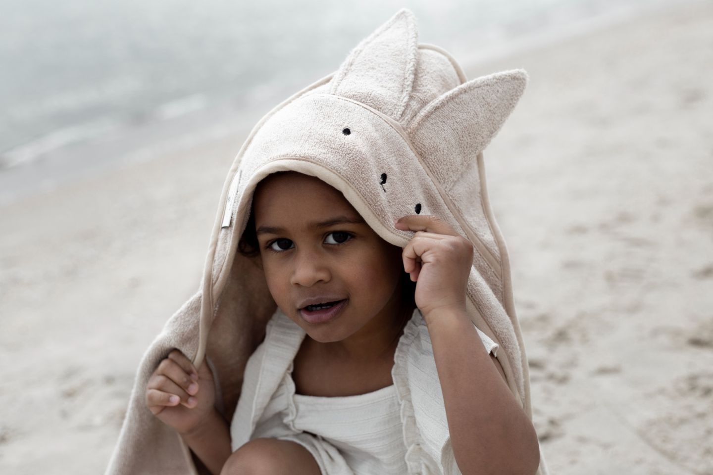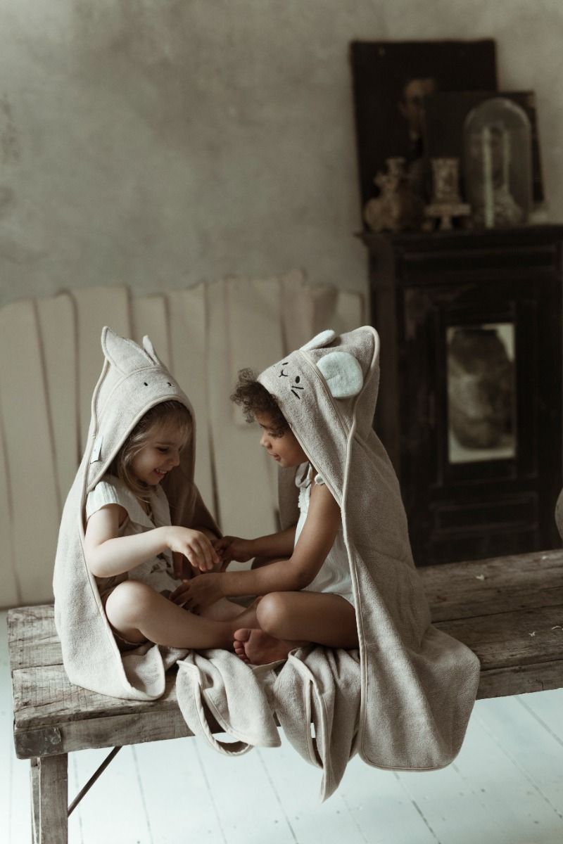 Ręcznik posiada urocze uszka i haft na kapturku, z tyłu natomiast funkcjonalną szelkę na szyję rodzica, ułatwiającą codzienną pielęgnację. Takie rozwiązanie pozwala rodzicowi przytulić maluszka bezpośrednio po kąpieli, dając poczucie bliskości i bezpieczeństwa.