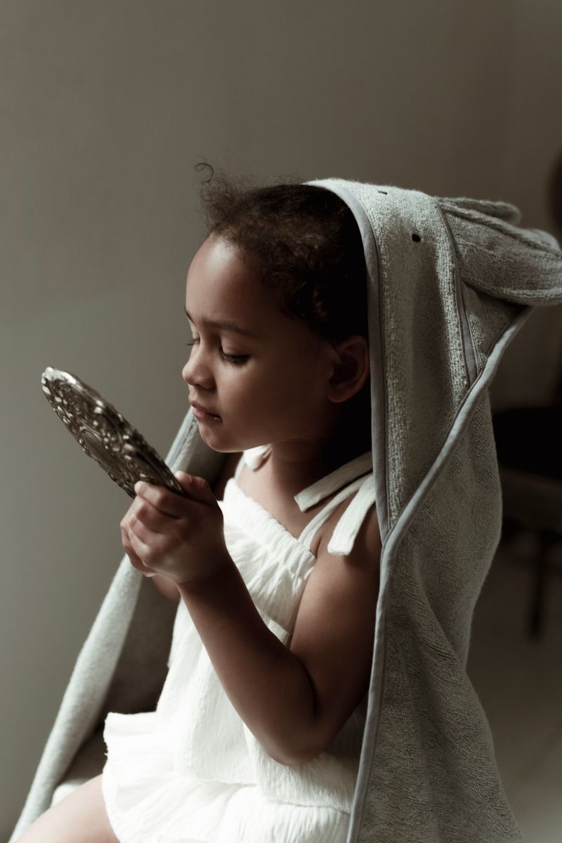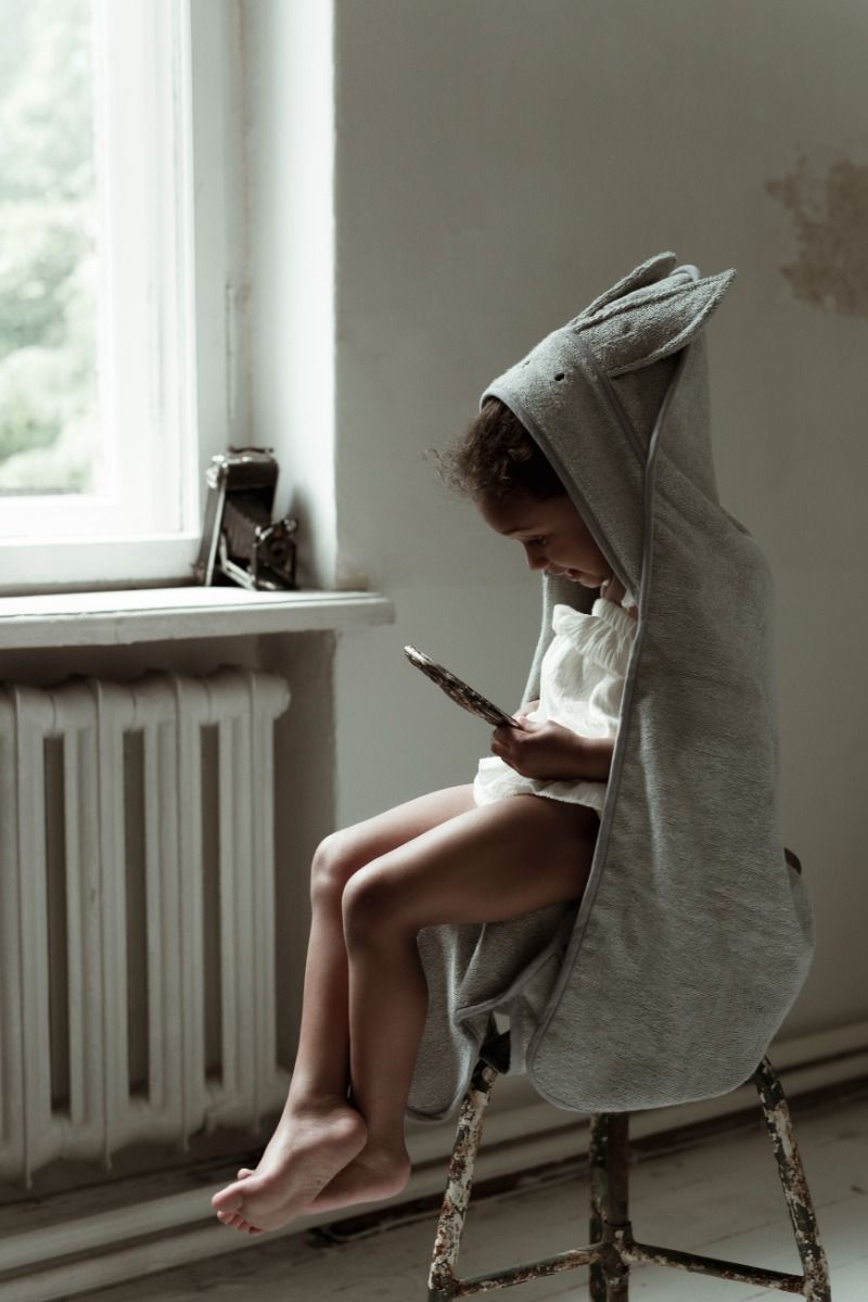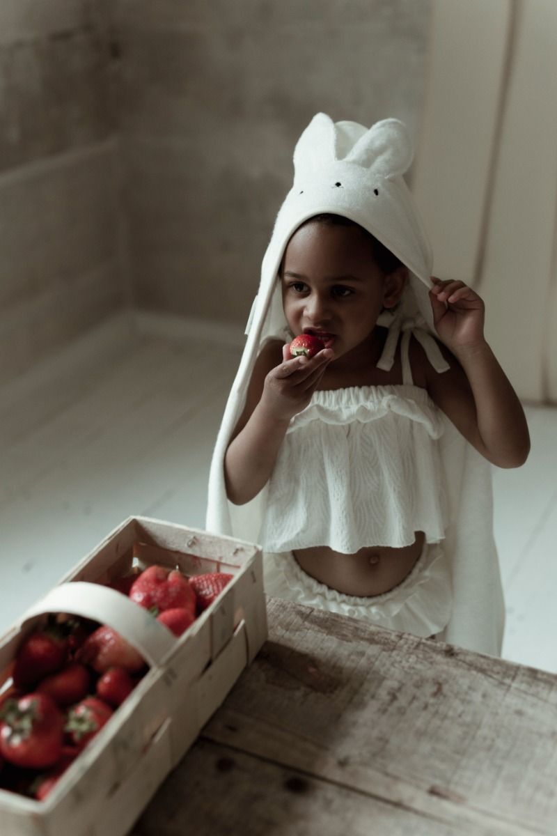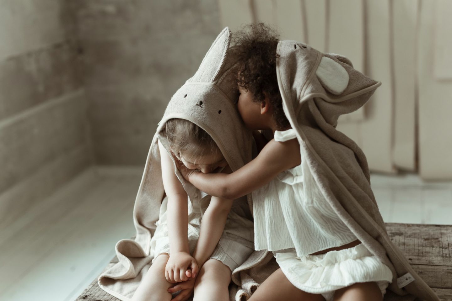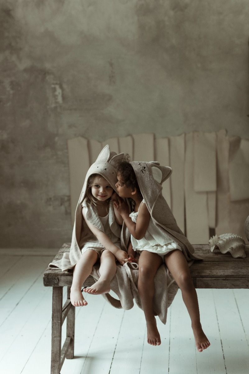 Ręcznik posiada urocze uszka i haft na kapturku, z tyłu natomiast funkcjonalną szelkę na szyję rodzica, ułatwiającą codzienną pielęgnację. Takie rozwiązanie pozwala rodzicowi przytulić maluszka bezpośrednio po kąpieli, dając poczucie bliskości i bezpieczeństwa.