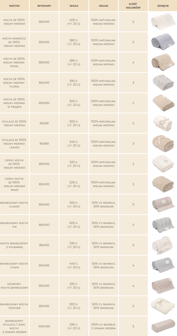 W naszej ofercie posiadamy kocyki całoroczne: Klasyczny, Warkocz, Pearl i Floral. Gramatura kocyka w splocie klasycznym oraz kocyka Floral to ok. 400 g, natomiast Warkocz i Pearl mają ok. 380 g. Kocyk Warkocz jest bardziej puszysty w dotyku, podczas gdy kocyk klasyczny oraz Floral jest zbity. Kocyk Pearl wyróżnia się luźniejszym splotem. Standardowy wymiar tych kocyków to 80×100 cm.